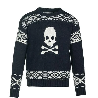 Men’s midweight wool blend skull motif crewneck sweater.